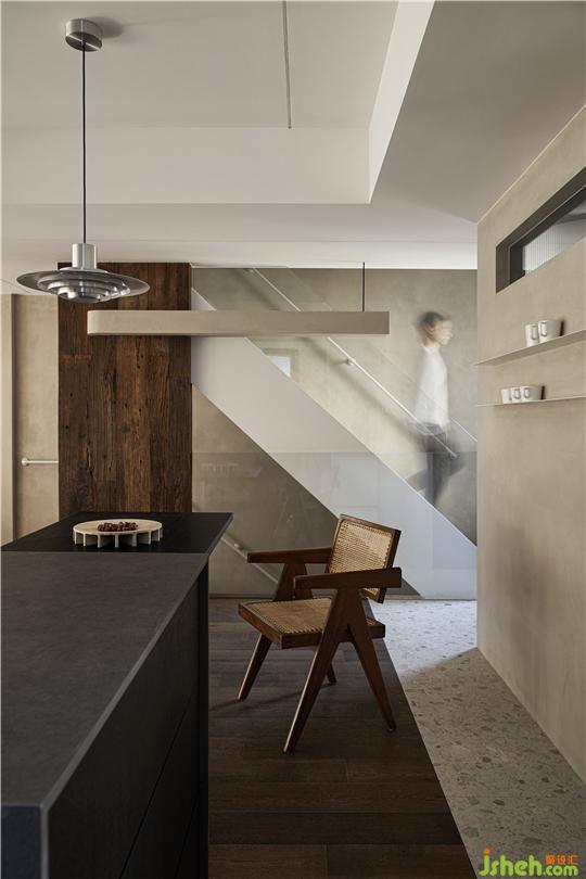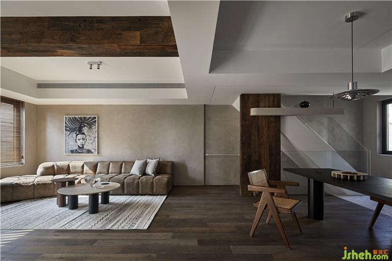 客廳在房頂做梁,樓梯做柱,建筑藝術(shù)穿插結(jié)構(gòu)的形式將老木頭放置其間,滿足居住者家居空間里要有老木頭運(yùn)用的要求。