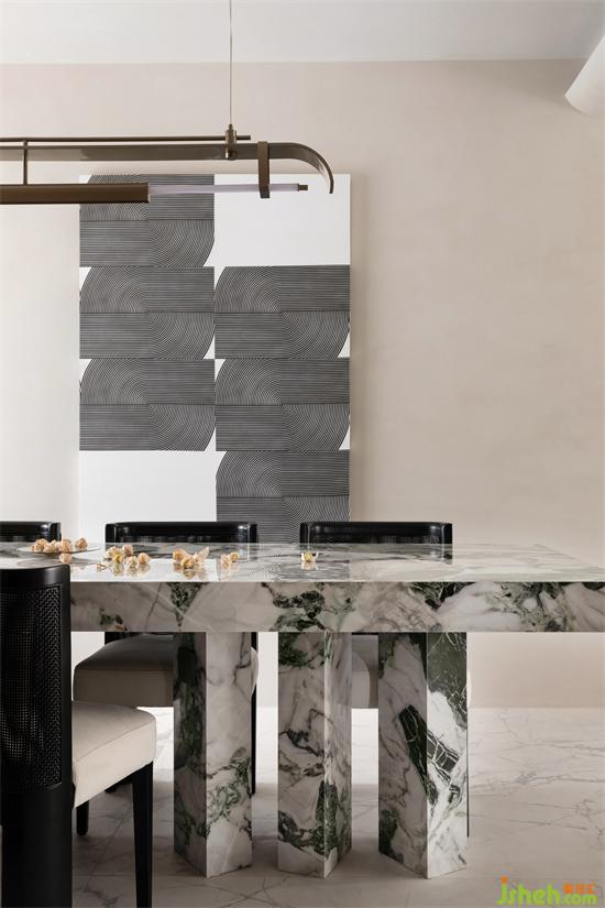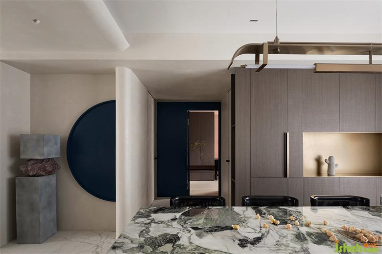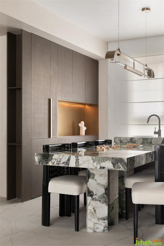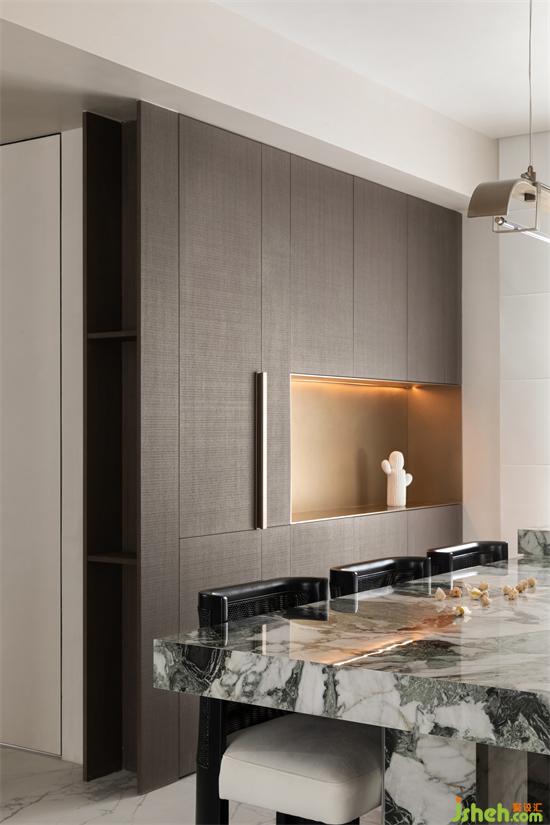 毗鄰餐廳的客衛(wèi)后移,為餐邊柜留出空間強(qiáng)化室內(nèi)設(shè)計(jì)師餐廚的收納功能;納入島臺(tái)元素,為家居生活方式提供更多的便利性。