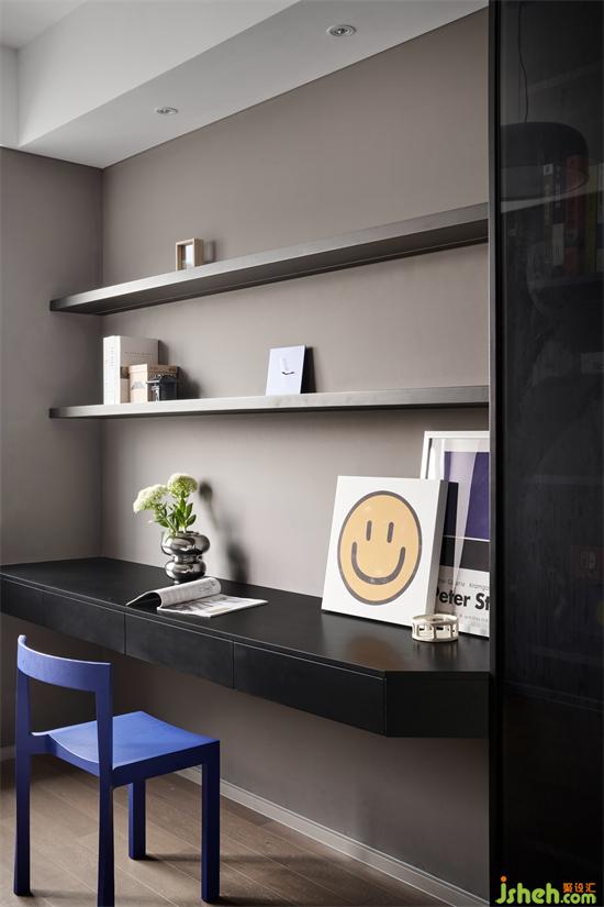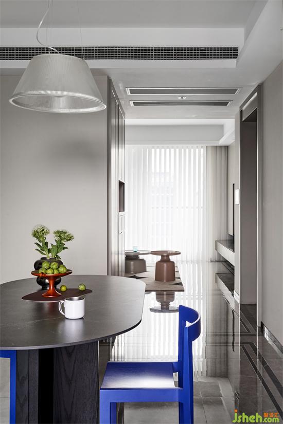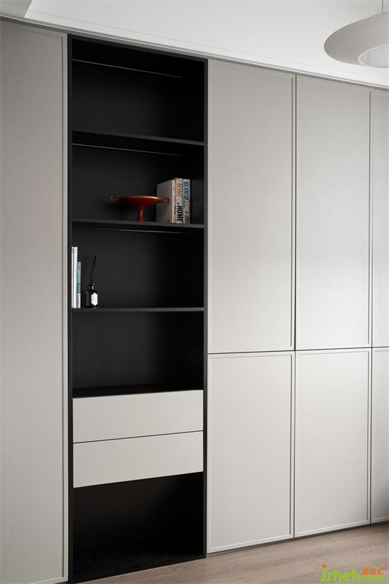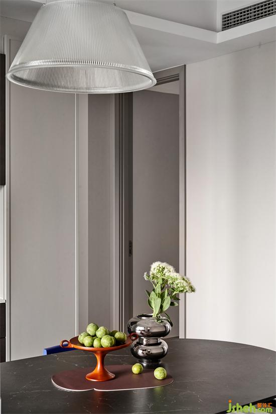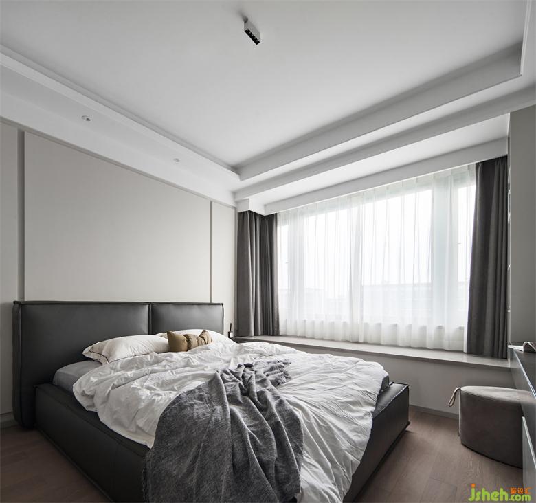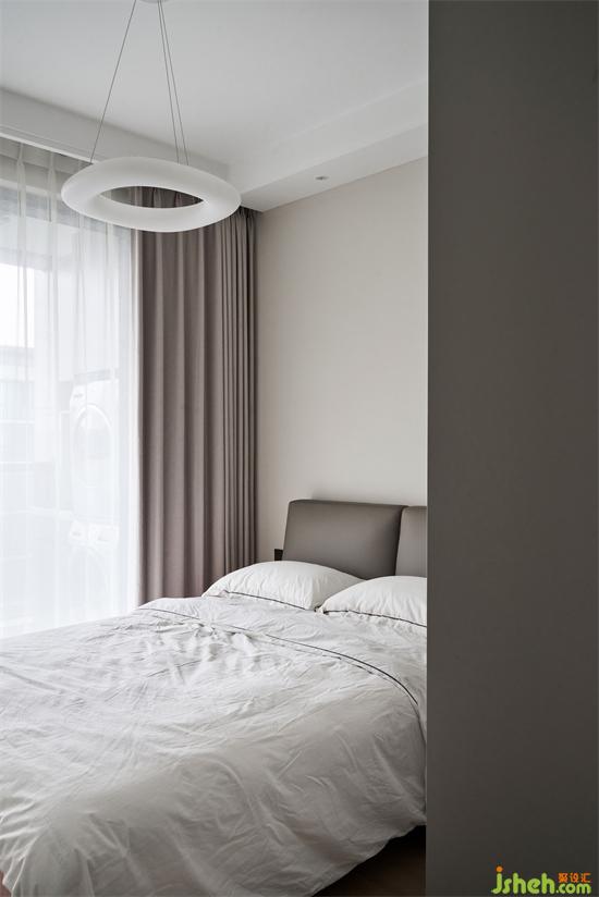 沙發(fā)背景繪寫手法沿用于主臥精簡、純粹的體塊塑造視覺立體感