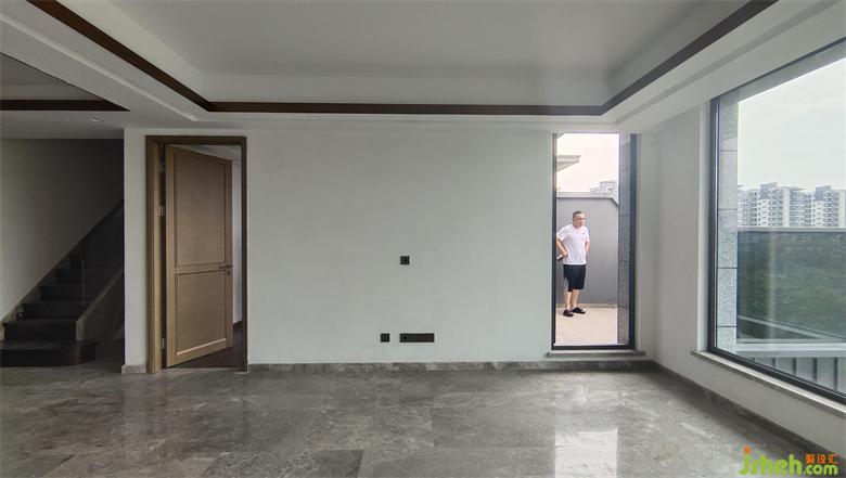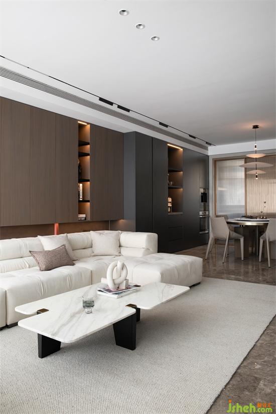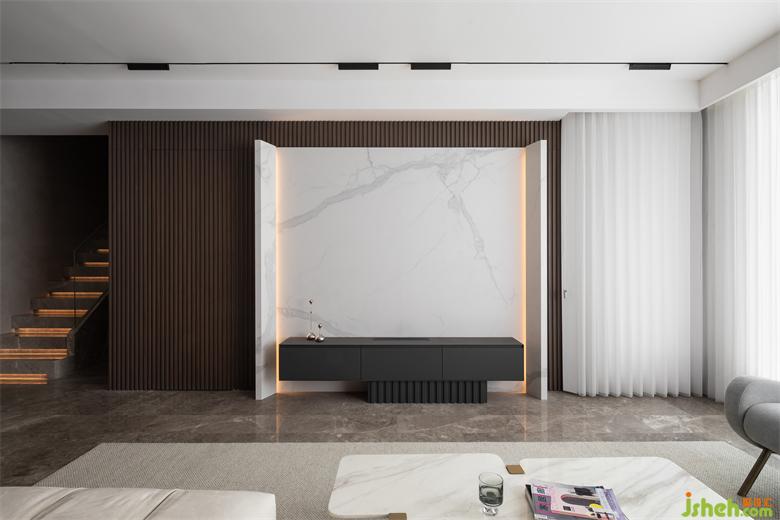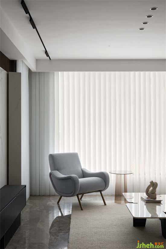 優(yōu)化空間區(qū)域的完整性,次臥入口做隱形處理與電視背景墻融為一體,右側陽臺門以窗簾為掩做疊排精裝房改造視覺清理,以純粹的比例塑造空間感受。