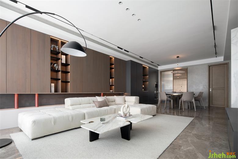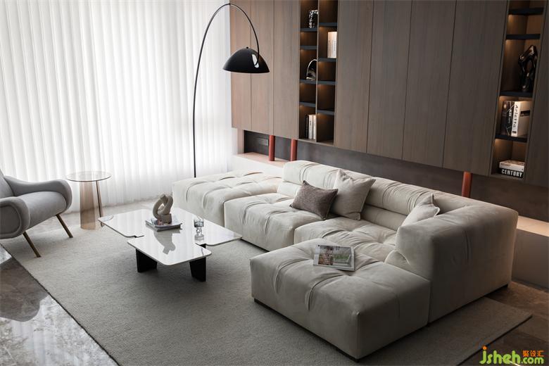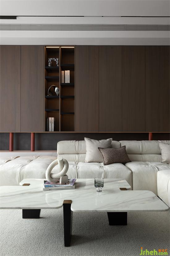The storage space placed behind the sofa is also a space background model, in which the grid shape inserted, the connecting posture of the red support column and the rock slab platform below, and the collision of color and material create a small interest in the calm space.
