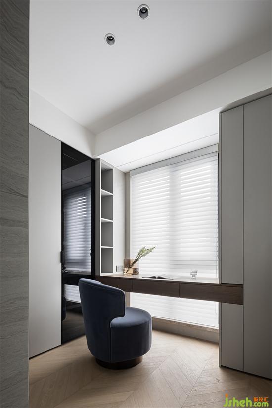 互動(dòng)的表現(xiàn)形式產(chǎn)生呼吸疊排精裝房改造感,靠窗位置做衣柜間的橫向穿插,生成的操作臺(tái)面作為梳妝臺(tái)使,利用自然光感打造區(qū)域功能的舒適性。