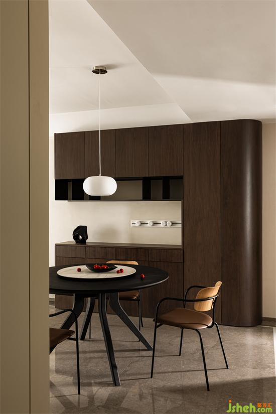 基于女主人的喜好,室內色彩游走于大地色系之中,空間色調協(xié)調統(tǒng)一,杭州和寧文華府裝修設計墻面與軟裝配飾結合棕色系,黑胡桃色作點綴加持空間質感。