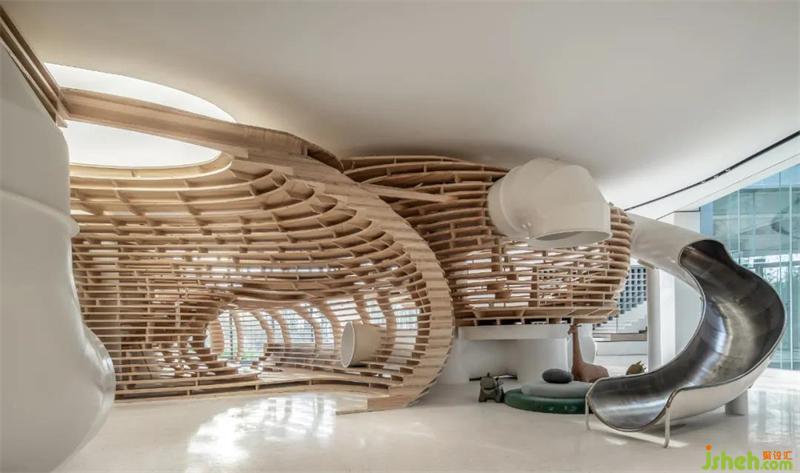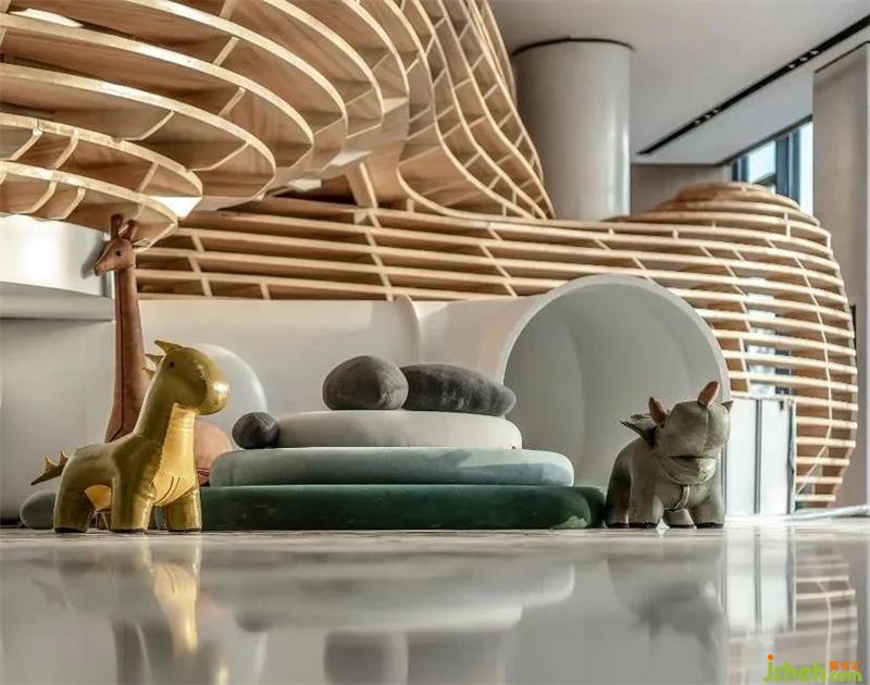 兒童閱讀區(qū)由城市島主題裝置構成,簡潔的木藝構架構建出山谷般的曲線形態(tài),呼應著當?shù)氐那鹆甑孛?。不同方位的洞口設置則為小朋友們營造出有趣的娛樂天地。武漢售樓處設計群羊藝術掛畫及布藝動物公仔共同詮釋著親近自然的主題。小朋友們不時從山洞中跑進跑出,與小伙伴們相互嬉戲,盡情享受著無憂無慮的孩提時光。