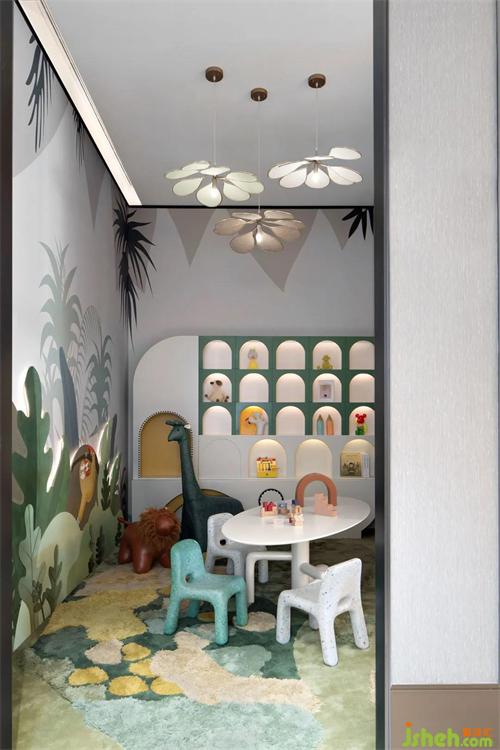 兒童區(qū)以“探險森林”為主題,將孩子的童真復(fù)刻在空間里,實木游戲版、皮質(zhì)公仔、實木烤漆書柜的軟裝搭配,讓孩子走進神秘溫暖的森林奇境。