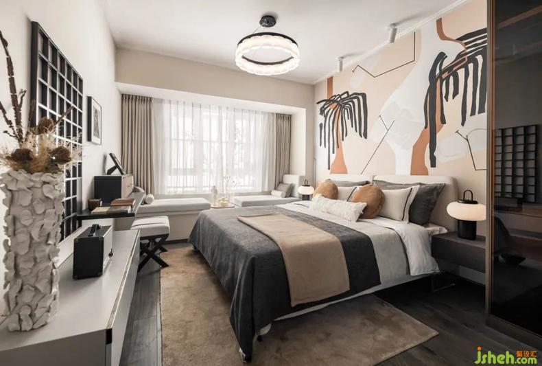 主臥運(yùn)用畫面線條的背景墻來延續(xù)空間的氣質(zhì),在張力十足的線條勾勒、樣板房設(shè)計(jì)層次豐富的材質(zhì)運(yùn)用以及極具質(zhì)感的裝飾細(xì)節(jié)下,不追求浮夸矯飾,構(gòu)造出一種樸素的精致及至精神張力的場域境界,光影變幻,重重悉見,動靜之間,風(fēng)格渾然