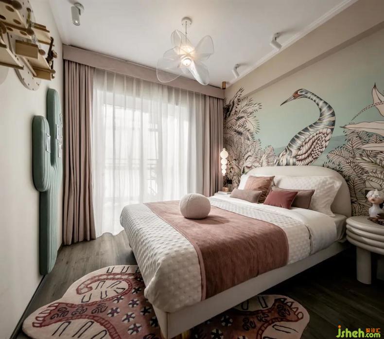 兒童房將無處不在的弧形引入房間,消除結(jié)構(gòu)上的銳感,樣板房設(shè)計再借不同低飽和度的顏色融入鮮活色調(diào),滲透在每個角落的點滴童趣,讓孩子房充滿柔和溫度。