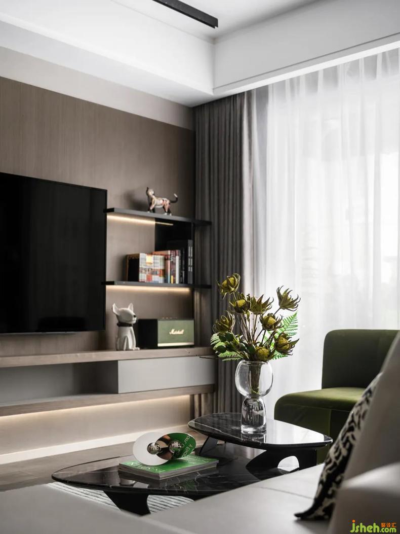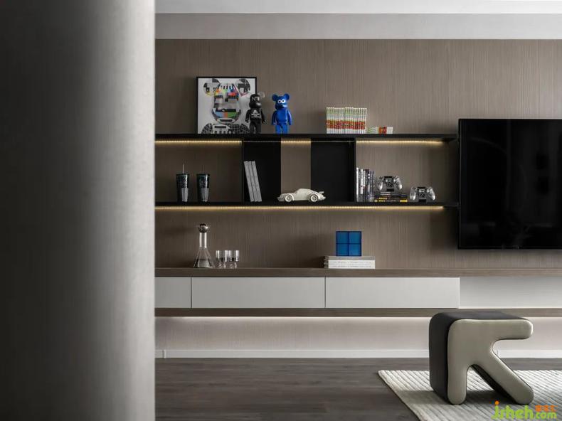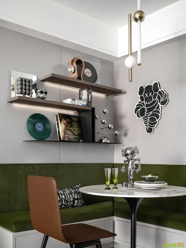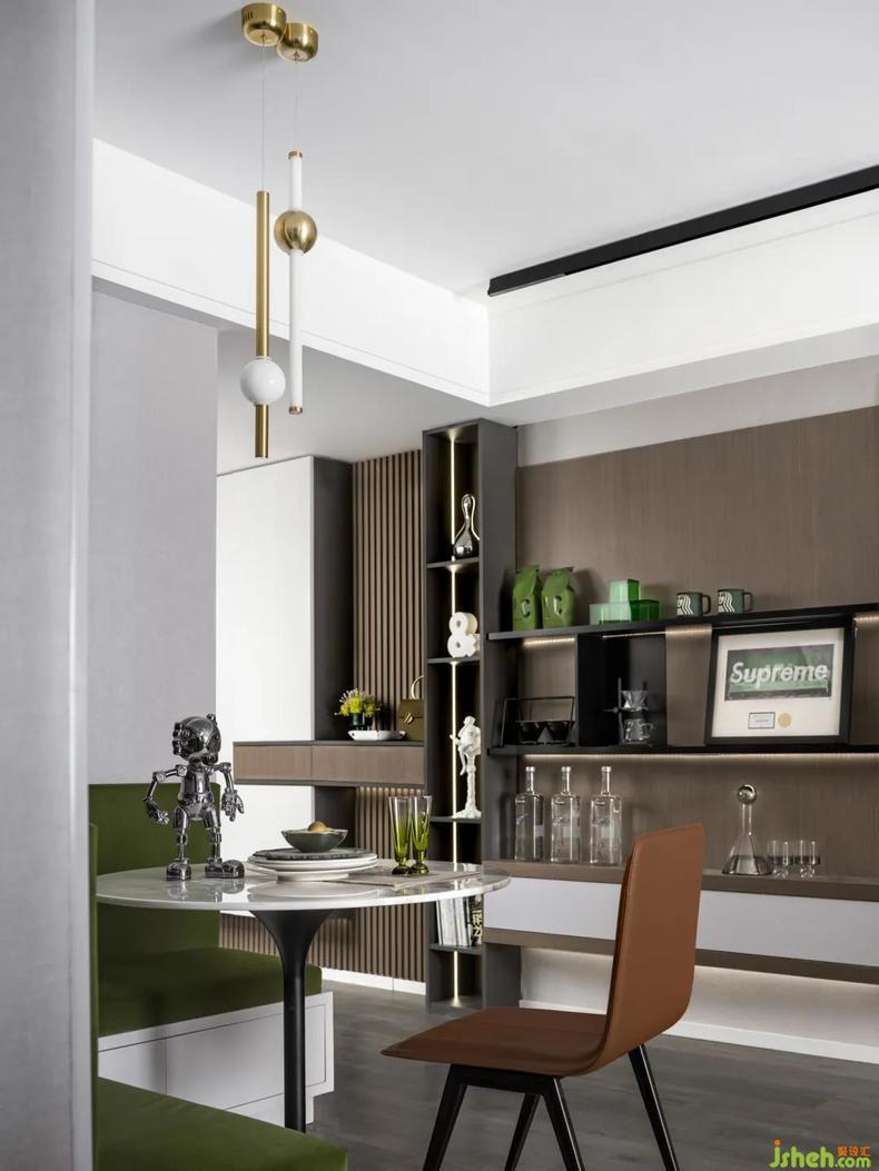 B戶型的設(shè)計(jì)通過(guò)模擬潮玩者每天每個(gè)時(shí)段的生活狀態(tài),以及所匹配到的空間氛圍,貫穿整套戶型的軟裝邏輯線索。整個(gè)空間在雅灰的鋪敘下,綠意的渲染中,皮革材質(zhì)的應(yīng)用以及深淺色彩的對(duì)比,增加了更多的空間品質(zhì)細(xì)節(jié)。舒適的皮質(zhì)主沙發(fā)配備大理石紋理的造型玻璃茶幾,多元肌理的木質(zhì)墻上放置最鐘愛(ài)的手辦和潮玩書(shū)籍。精準(zhǔn)的比例把控和寧?kù)o理智的色系搭配,樣板房設(shè)計(jì)彰顯主人個(gè)性的同時(shí)展露出對(duì)品質(zhì)與格調(diào)的不懈追求,讓人身處起居空間松放情緒,療愈煩。