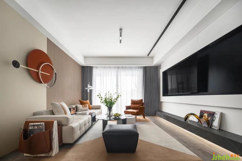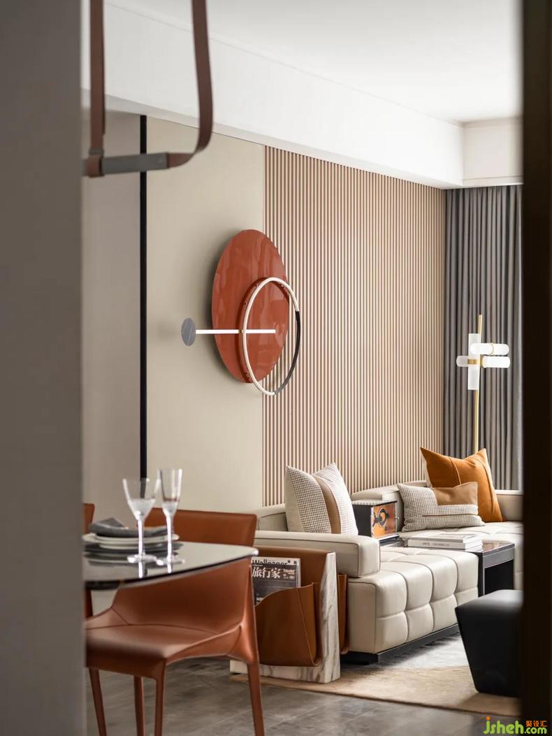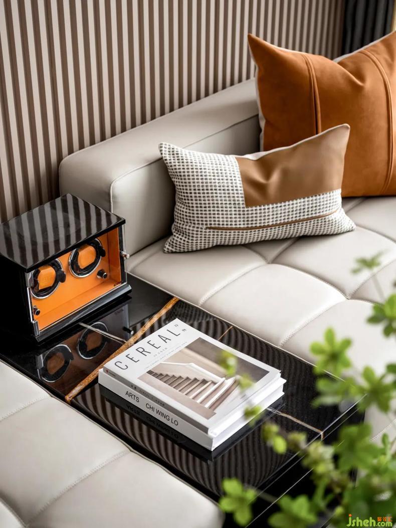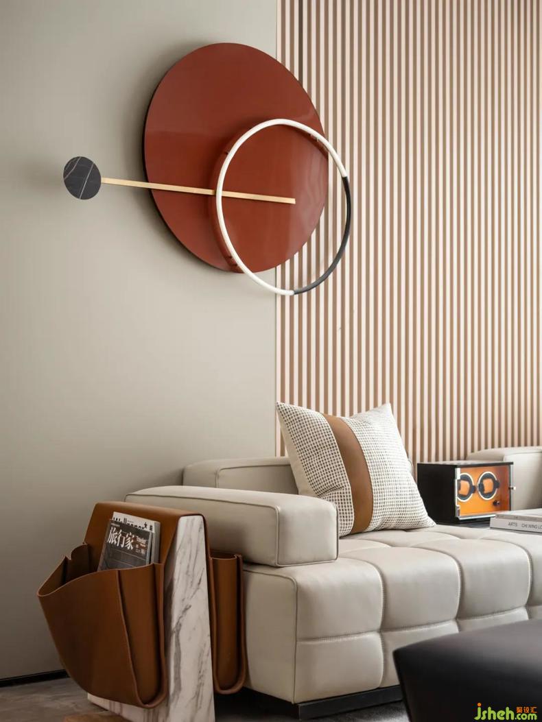 在客廳中,色塊拼接的淺咖地毯和木板地面搭配,灰白的沙發(fā)上跳躍著暖棕的皮革抱枕,深沉的黑色小客桌于地毯上協(xié)調(diào)呼應(yīng),勾勒出淡淡的秋意。倚靠的墻壁時(shí)鐘裝飾提升空間創(chuàng)意調(diào)性,凸顯對(duì)男主人生活的獨(dú)特見解,不追求浮夸矯飾,構(gòu)造出一種精致及至精神張力的場(chǎng)域境界。