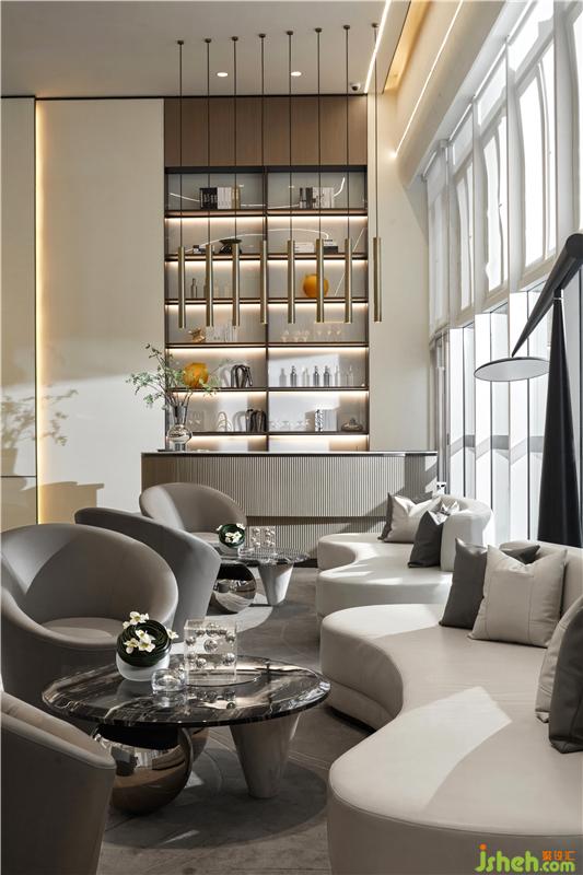 洽談區(qū)在于充分發(fā)揮玻璃幕墻與景觀的優(yōu)勢,弧形半包圍陳設,劃分和定義不同的空間屬性,但又不隔斷空間,拉長客戶開放區(qū)域的空間軸線使空間保持統(tǒng)一與連貫性的同時,塑造時尚大氣的空間氛圍。