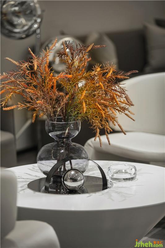 在室內(nèi)空間,軟裝是賦予空間生活與活力的重要元素。本案對于售樓處軟裝的構思,主要也是來源于對幾何形體的思考,結合對空間的概念延伸,將材質(zhì)與色彩進行提煉和整合,形成軟裝的主風格。