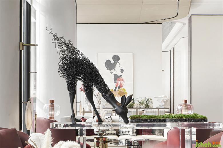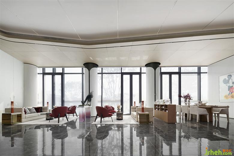 藝術(shù)賦予空間靈魂,穿插于其中的藝術(shù)品增強(qiáng)了空間的表現(xiàn)力,也給予來(lái)訪者更多的想象與藝術(shù)互動(dòng)的體驗(yàn)。洽談區(qū)臨窗設(shè)立,整個(gè)空間內(nèi)以大氣的暖白色調(diào)為主,車(chē)?yán)遄蛹t點(diǎn)綴其中,通透且雅致,同時(shí)讓空間與室外景觀更好的呼應(yīng)融合,相得益彰。