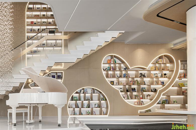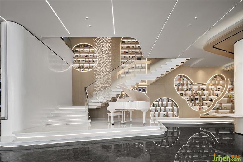 特意在室內(nèi)空間開(kāi)辟童玩書(shū)吧區(qū),結(jié)合米奇頭像而打造的書(shū)架讓整個(gè)空間氛圍童趣感十足。從二樓垂落的水晶吊燈,映射著夢(mèng)境與現(xiàn)實(shí),引發(fā)人們對(duì)美好未來(lái)的遐想。