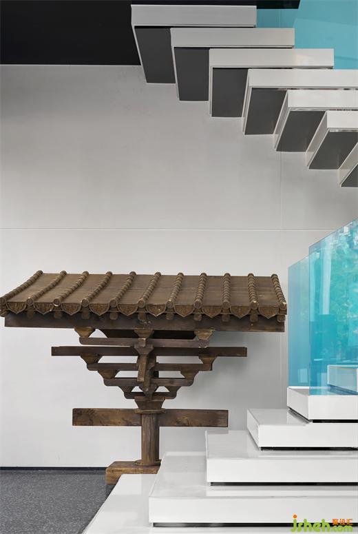 接待區(qū)加入了牌坊裝置藝術(shù),形式來源抽取了宋式牌樓的元素,用透明樹脂材質(zhì)打造了相似水晶牌坊,讓過去與現(xiàn)在宛如穿越時(shí)空之門般在這里相遇。
