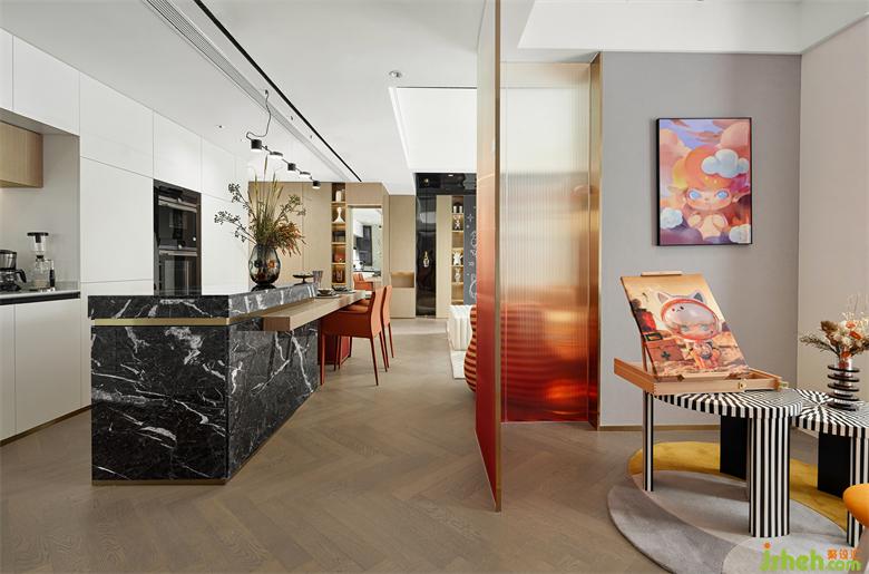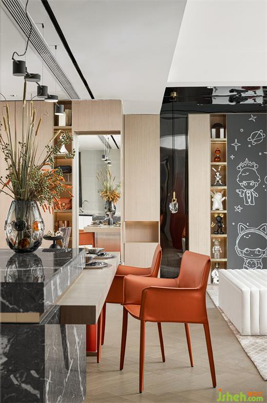 活潑輕松的餐廳空間,融入時尚藝術的設計元素,創(chuàng)造出一個極具操作性的時尚空間。功能與藝術的結合碰撞出時尚沉穩(wěn)的空間感受,通過色彩和優(yōu)質(zhì)家具的搭配,營造出溫馨而富有質(zhì)感的現(xiàn)代摩登家庭生活。
