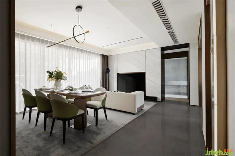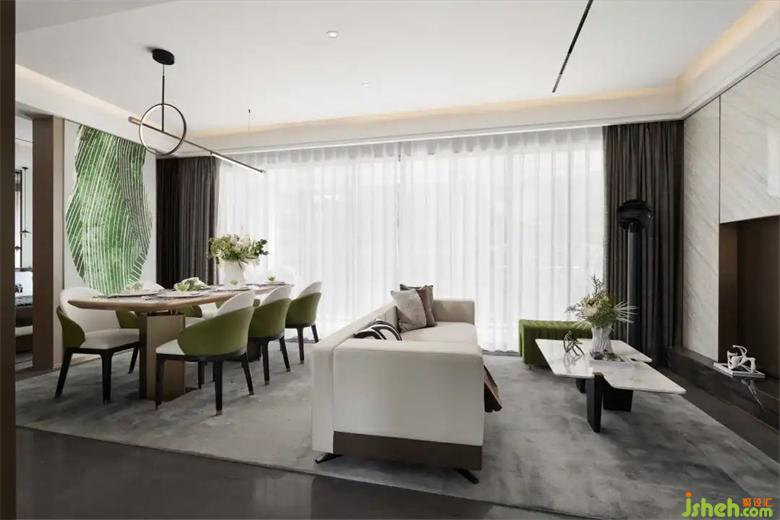 開(kāi)放式的客餐廳,樣板房設(shè)計(jì)根植于理想主義與藝術(shù)美學(xué),寬大落地窗和植物配合,最大化地呈現(xiàn)空間之間的互動(dòng)連通關(guān)系,并依靠一面陽(yáng)臺(tái)實(shí)現(xiàn)室內(nèi)外的聯(lián)動(dòng),引導(dǎo)自然與生活相互融合。