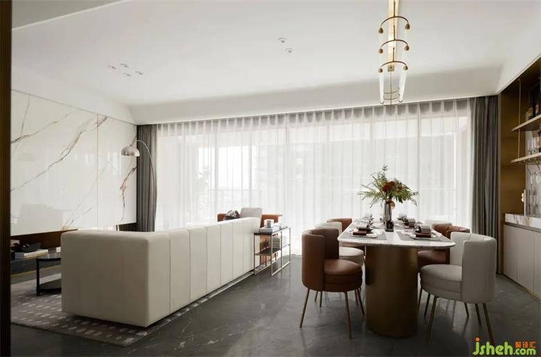 客廳與餐廳并無間隔,藝術氛圍與情感交流在開放空間中互動,美景與美食相得益彰,樣板房設計來承擔起真實親密的三餐四季。當空間中的一切都妥帖有序時,才能帶給人們安寧的感覺,而安居在家中,人們擁抱的就是一個有溫度的世界。