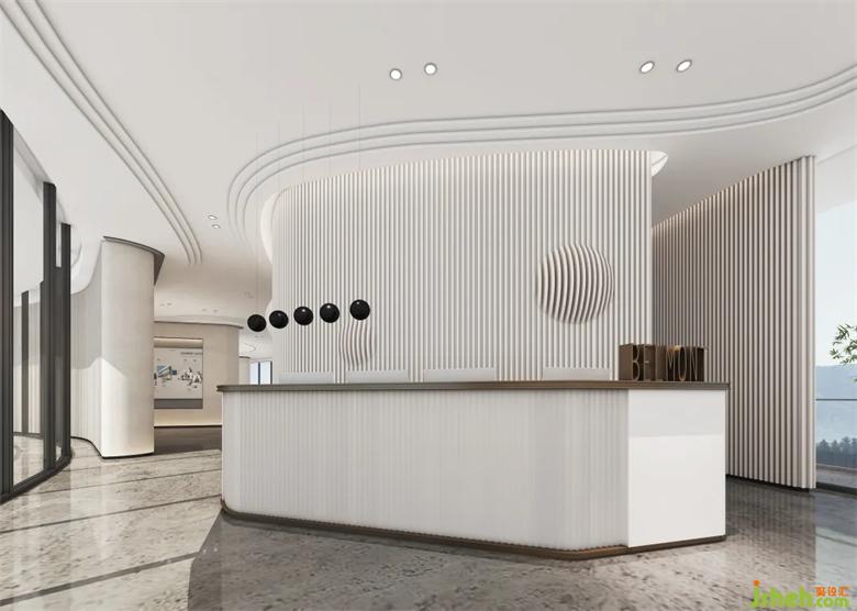 在對(duì)行走動(dòng)線合理的計(jì)算和考量下,設(shè)計(jì)師對(duì)接待臺(tái)面積占比和體塊劃分方面做了精細(xì)化處理。同時(shí),以貝蒙客戶被親切喚作“貝客”取其諧音“貝殼”做延展,重慶售樓處設(shè)計(jì)在墻面利用豎線肌理的元素,作出凹凸質(zhì)感,襯托出品牌背后的厚重感。
