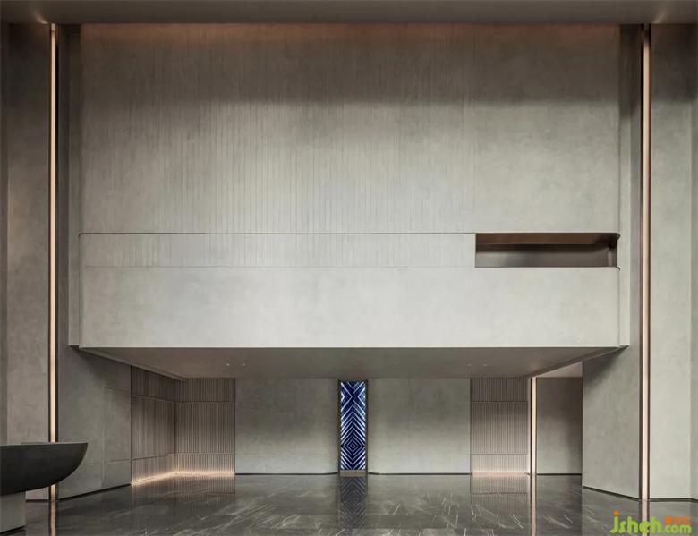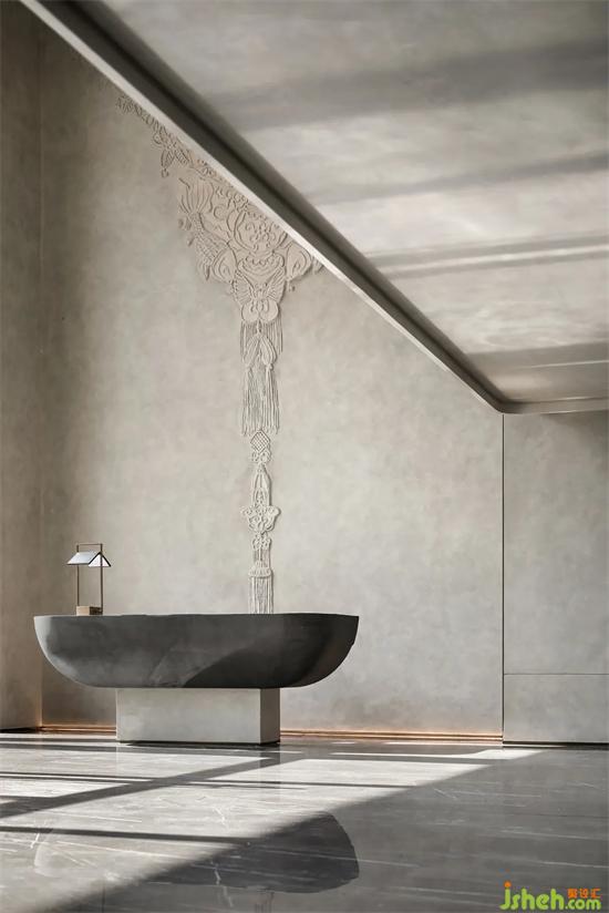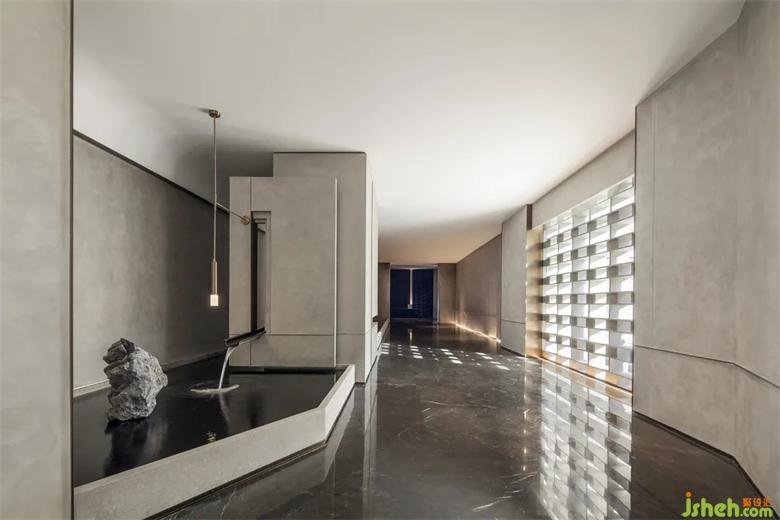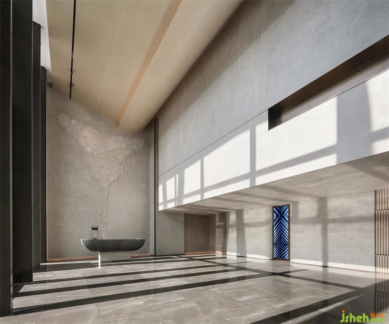 超高挑空塑造了入口處的厚重氣勢(shì),精細(xì)雕琢的細(xì)節(jié)與體塊變化,也讓空間更為靈動(dòng)。會(huì)所設(shè)計(jì)石與景的穿插,引室外景色到室內(nèi),內(nèi)外形態(tài)的蔓延,牽引著入室者的視覺體驗(yàn)。