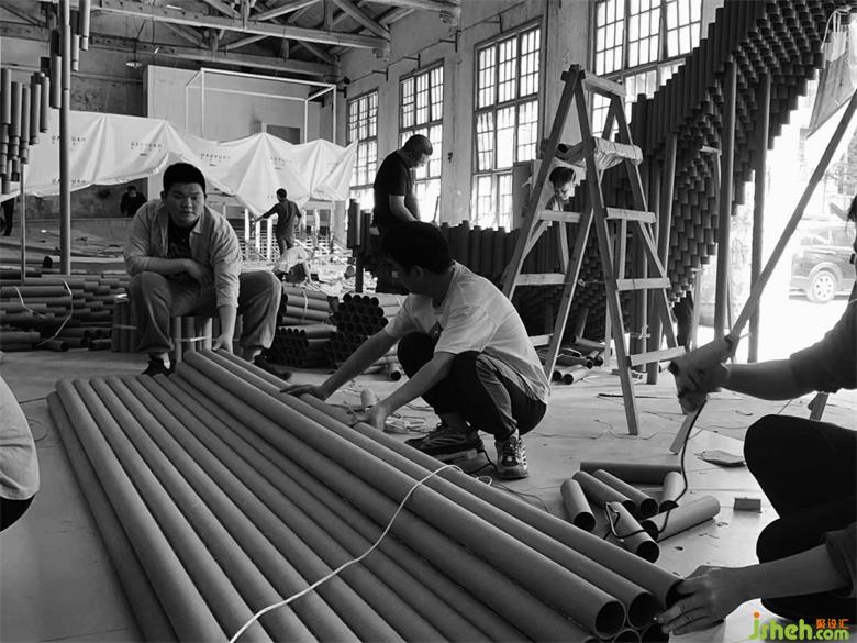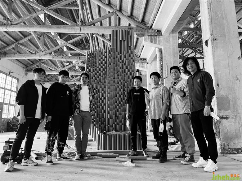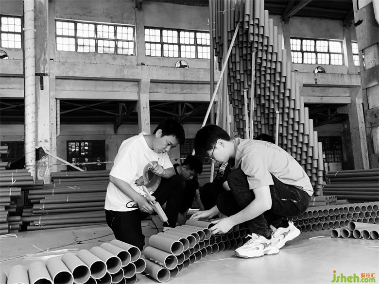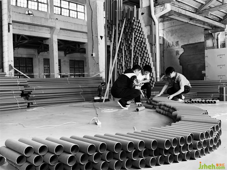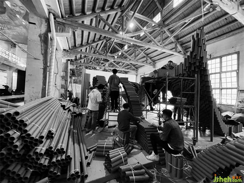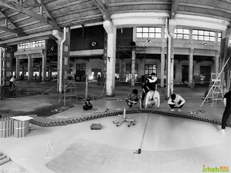 在搭建的第三天晚上,還遭遇了重慶史上難遇的9級大風,因為現場是廢舊的廠房,早已無完整的長門和窗外做遮擋,作品的力學支撐也還未完全成型,前幾天搭建好的損壞了近三分之一。