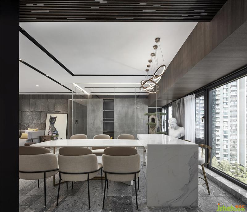 空間人文感知:設(shè)計(jì)師從本案重新探索玻璃、石、木等材料的有機(jī)結(jié)合,將崇尚自然復(fù)古的情緒融入進(jìn)空間,挖掘人文原始對自然材質(zhì)的心理感受。使現(xiàn)代空間更具原始、摩登氣質(zhì)。