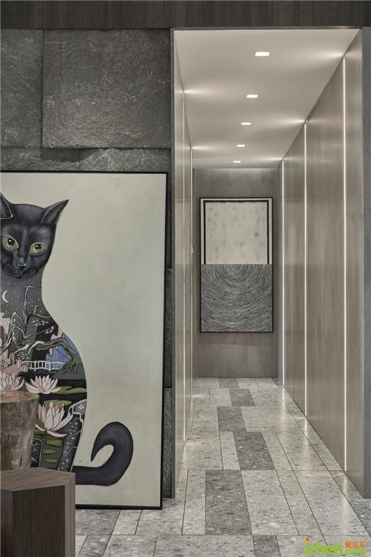 空間趣味感知:玄關(guān)木與玻璃矩形拼接的矩陣隔斷于入臥過道的矩形方塊拼接的機(jī)器人,他們之間是有形式結(jié)構(gòu)的趣味呼應(yīng),以及體現(xiàn)主人愛“貓”情節(jié)的大畫幅貓及貓的裝置品。形成軟裝配飾之間的相互呼應(yīng),展現(xiàn)了空間的趣味性。
