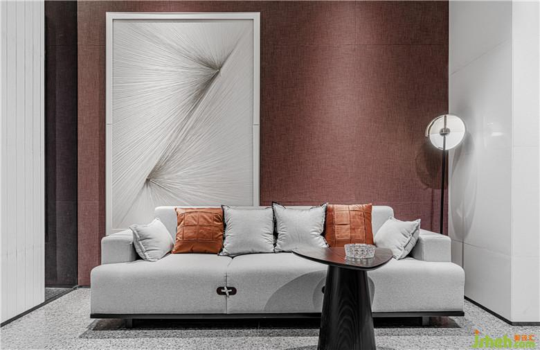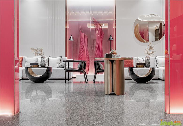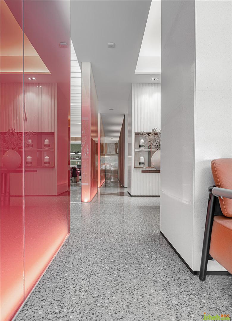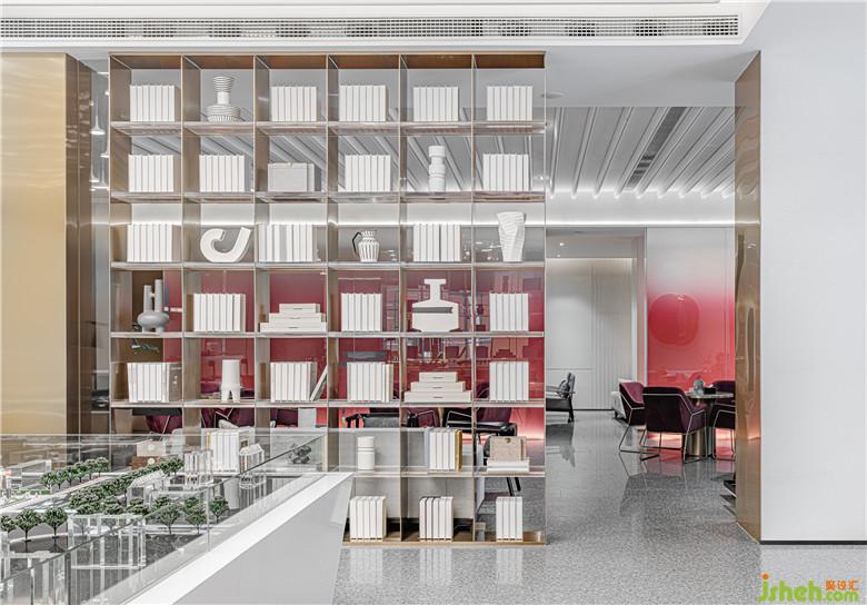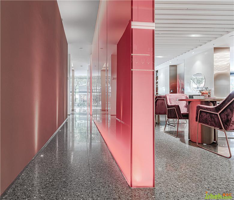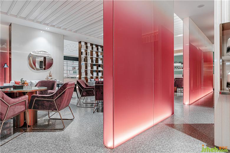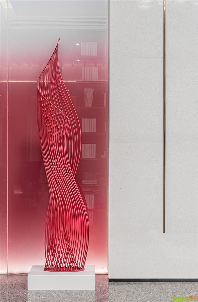 洽談區(qū)最是濃墨重彩。亞克力板染上大面塊的紅白漸變,創(chuàng)造出若隱若現(xiàn)的效果。點(diǎn)綴以數(shù)個(gè)紅色雕塑,宛如叢叢焰火乍現(xiàn)。梨紅色的家具壓暗一個(gè)色調(diào),為洽談區(qū)形成豐富的視覺層次;光滑的鏡面以及延續(xù)其中的黃銅金屬,恰到好處地平衡洽談區(qū)色彩的濃度。