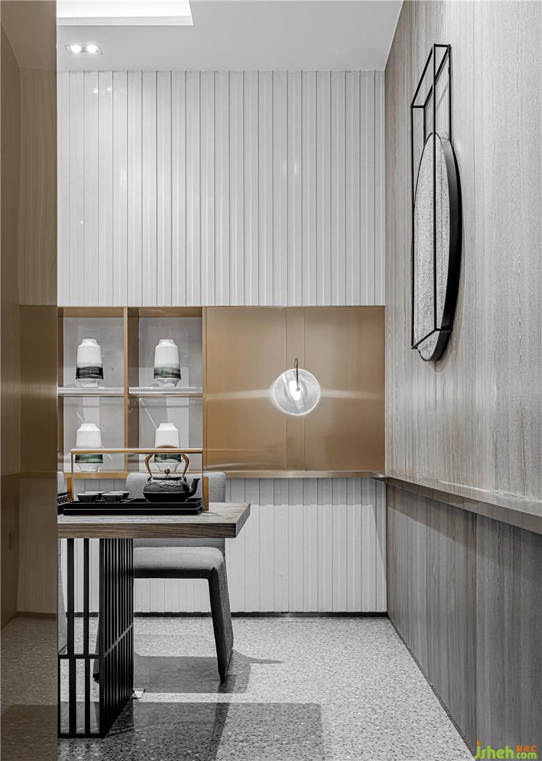 后場(chǎng)的茶室和收銀區(qū)中,紅色仍在流轉(zhuǎn)。室內(nèi)設(shè)計(jì)師借用隔斷,茶室一分為二;偏中式風(fēng)格的一端保留了灰白+黃銅的搭配,與沙盤區(qū)的色彩調(diào)性相似,回歸了舒緩的氛圍,從而創(chuàng)造了前呼后應(yīng)的色彩節(jié)奏。