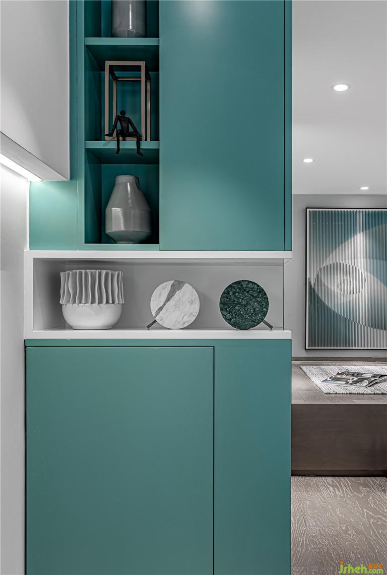 電視墻拐角處的收納展示柜,由一條蜿蜒的燈帶作線索,與樓梯另一端的壁柜遙相呼應。心愛的收藏,采擷的片段,被貼心的收納系統細致妥善地安放。