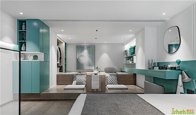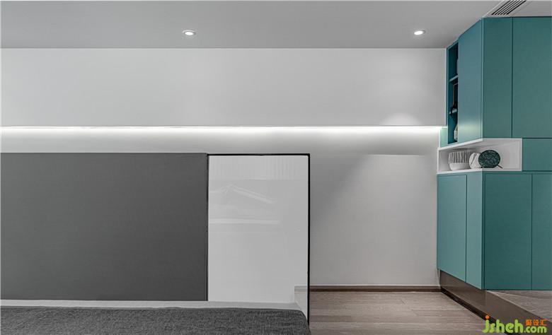 抬高兩層級差,休閑區(qū)結合衣帽間、運動、休憩等多樣功能,既提高了空間的利用率,顯得活潑有趣。“剛剛好”的空間占比,提供的是徜徉、漫步、沉思和專注的自由。