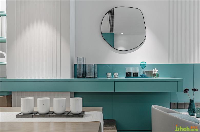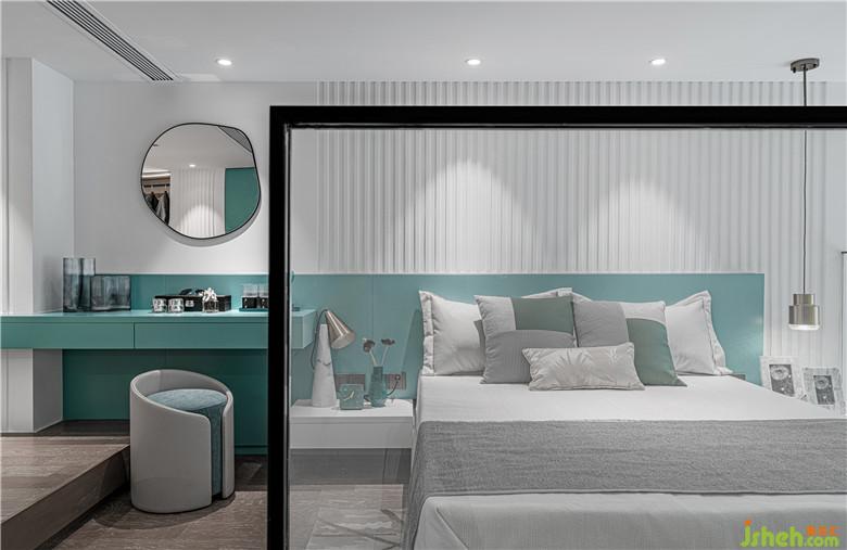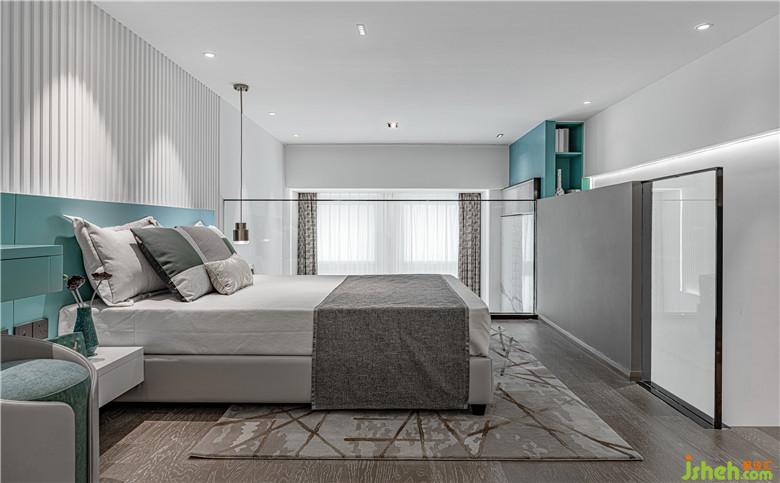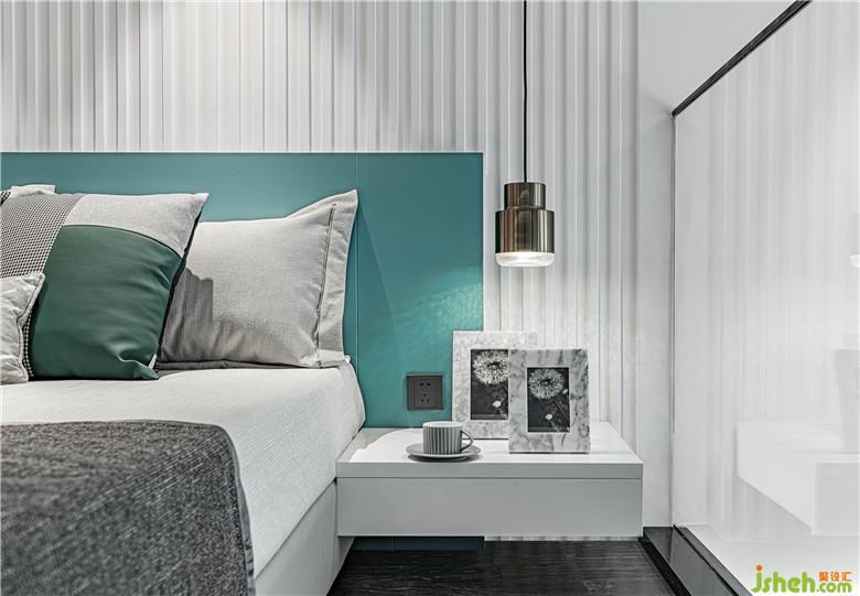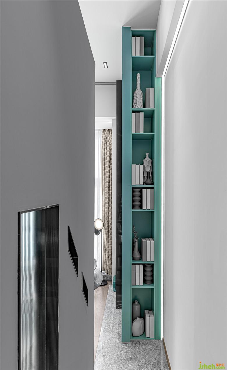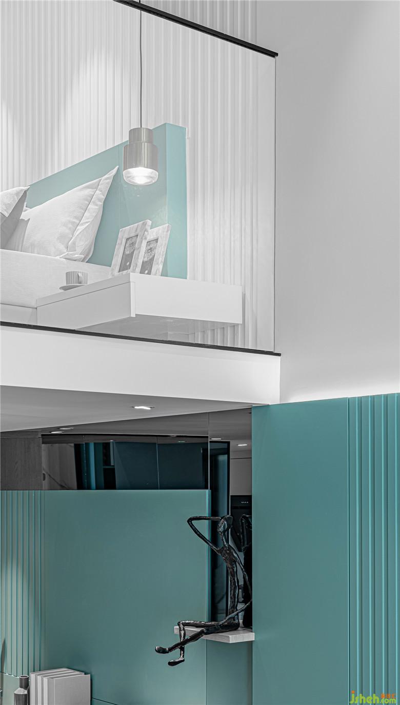 如果說下層的動區(qū)充滿了流連的動感,那么上層則體現著色彩的靜美。細框鋼化玻璃的加入,使上下兩層在戶型特點下并不完全割裂,視線和動線的交互更為開放和輕盈。