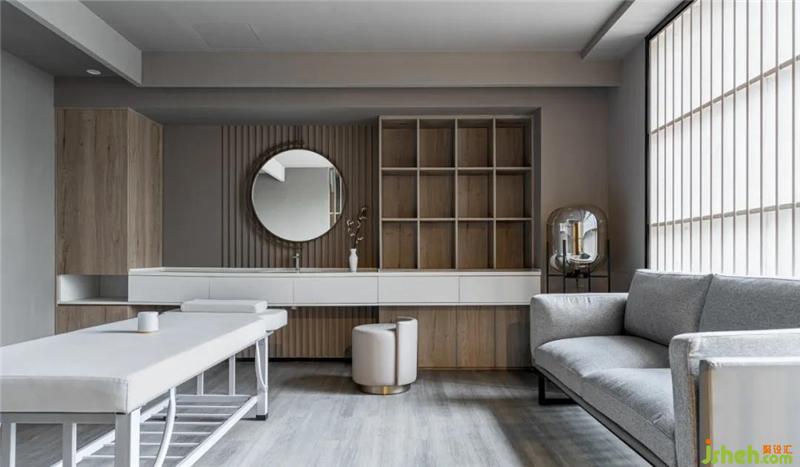 VIP室同樣延續(xù)了整體空間的材料質(zhì)感,同時(shí)用體塊化的手法處理臺(tái)盆、衣柜與儲(chǔ)物柜的關(guān)系,使其達(dá)到視覺上的平衡。