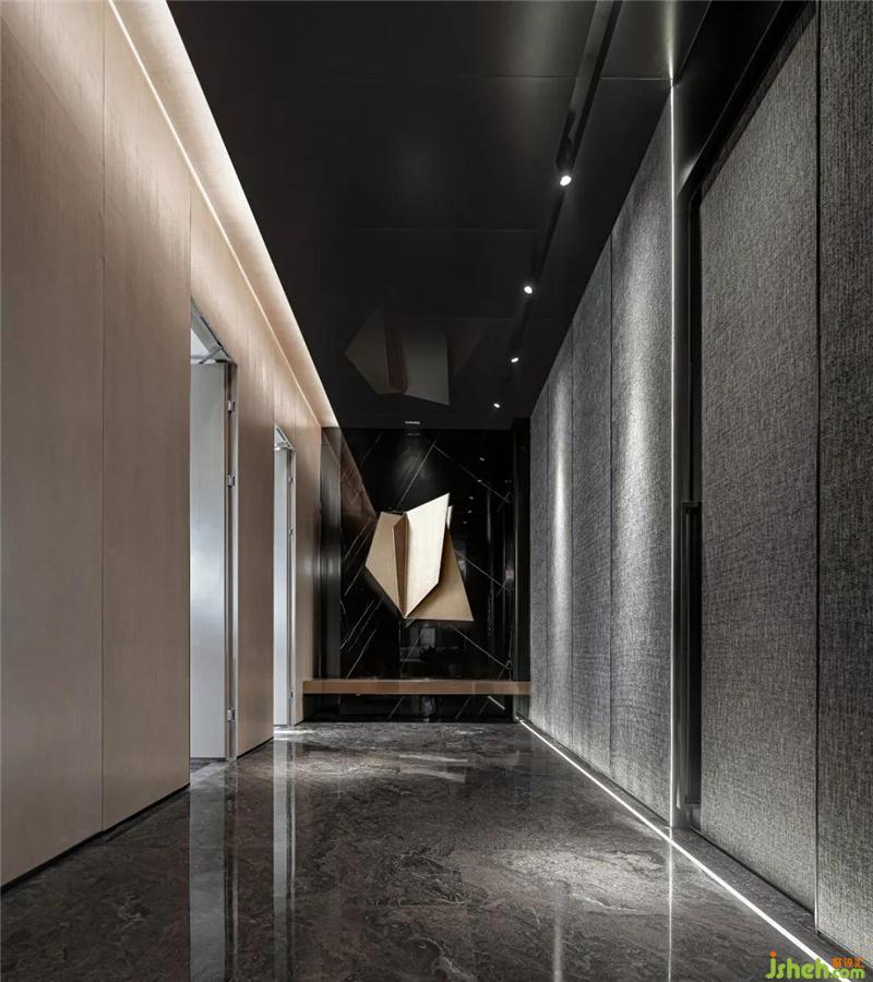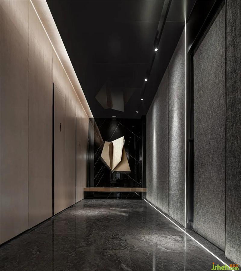 不銹鋼的天花、不規(guī)則的掛飾、不平滑的墻面,粗糲斑駁的大理石,過道空間同樣點題。細長的地?zé)魺魩缤窐?,延展指引到另一重截然不同的空間。