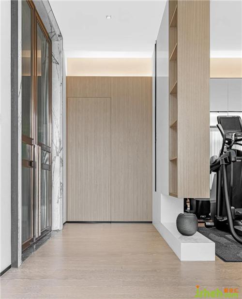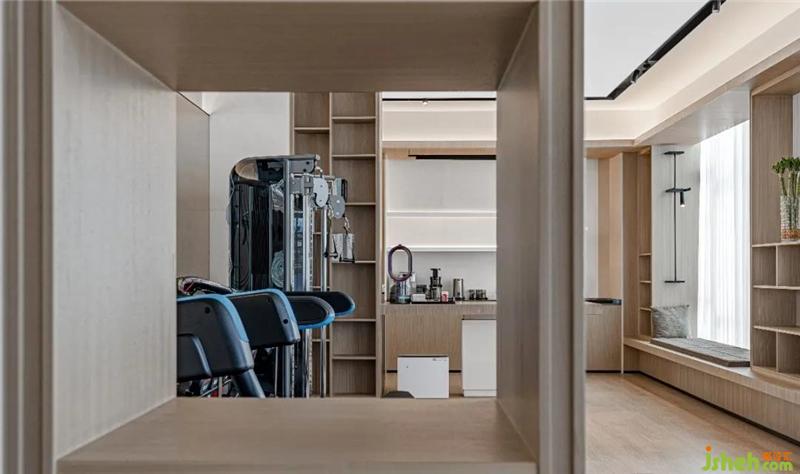 下層的健身房書吧采用大量的木飾面和白色大理石作為色彩基調(diào),顯得舒緩、溫馨而且明亮。沿著動靜結(jié)合的思路,以空間盡頭的Mini餐吧為中軸,運動區(qū)和閱讀區(qū)平分秋色,創(chuàng)造一個滿滿人氣的放松好去處。