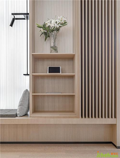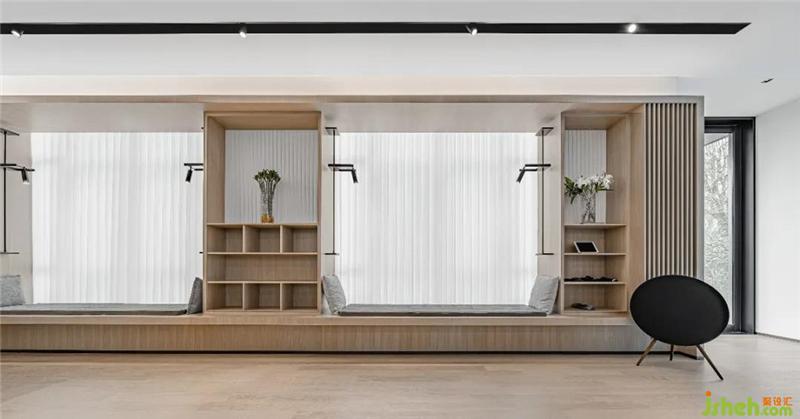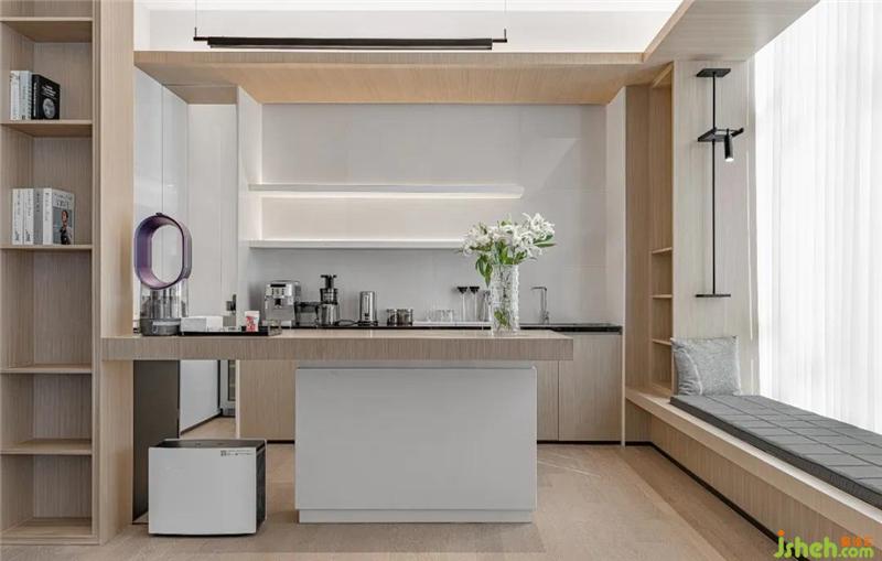 臨窗的咖啡休閑區(qū)依傍著餐吧,經(jīng)溫潤的木飾面柜體虛實裝飾,展示出渾然一體的完整性。錯落的收納空間,連貫著可容納多人的閱讀窗臺,產(chǎn)生了相當有趣且實用的立面韻律,不露痕跡地強調(diào)了功能分區(qū)。