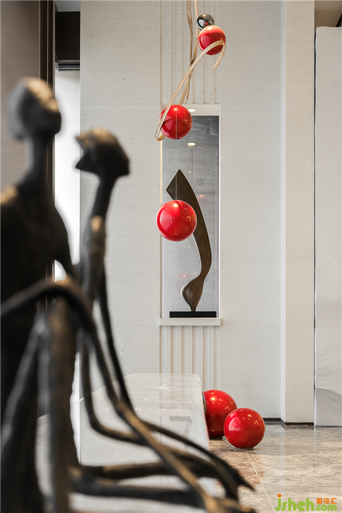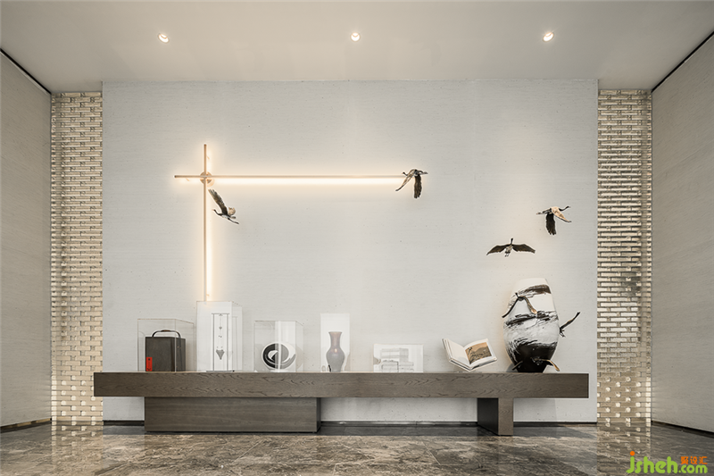落地窗最大限度地將自然光引入,大理石體塊消融了各個區(qū)域之間的界限,光線得以恰如其分地融入空間。藝術裝置的線條流暢而有意趣,與掛畫繪制的飛鳥圖案形成一幅符合自由美學的畫面,給人以清脫高雅的觀感。