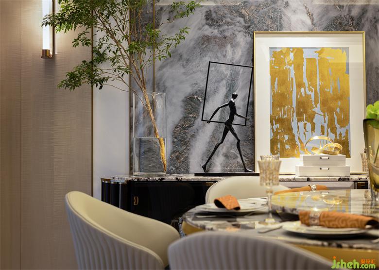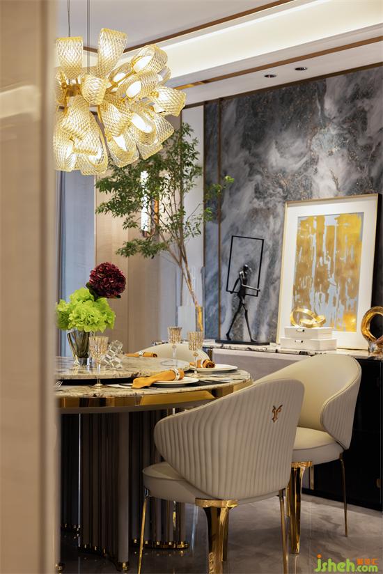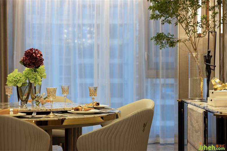 自然光透過(guò)紗簾灑入,大平層裝修設(shè)計(jì)與室內(nèi)光源同頻。結(jié)束工作回到家中,烹飪、用餐,靈動(dòng)的設(shè)計(jì)感,創(chuàng)造出愉悅就餐的場(chǎng)所,情感與香氣環(huán)繞於此。