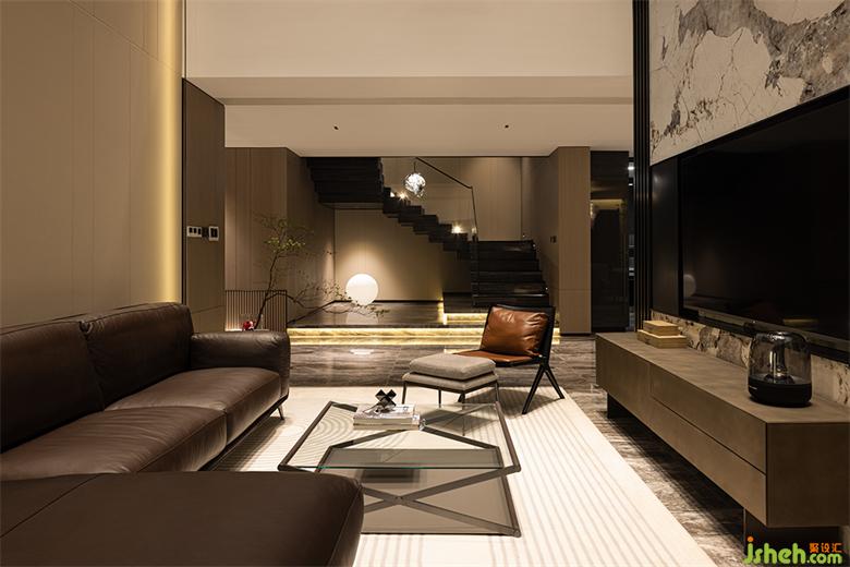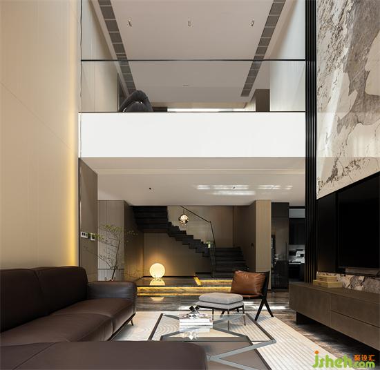 挑空的縱深感,增進(jìn)了上下樓層的互通對話,挑空區(qū)的立面置入半墻玻璃隔斷,現(xiàn)代別墅裝修設(shè)計既保留了通透視野,也能予以居住者更多安全感。