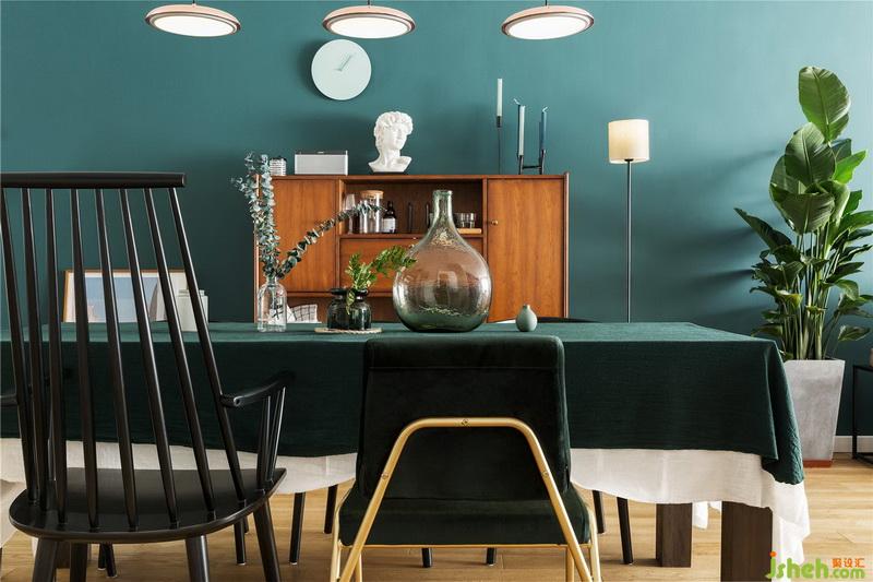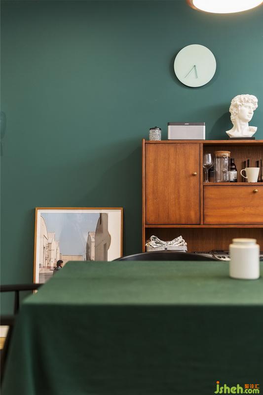 藍(lán)綠色圓形小掛鐘跟墨綠色的背景墻形成絕佳視覺(jué)體驗(yàn),同屬于綠色系,色度的遞進(jìn)即不會(huì)減弱背景的存在感,也突出了掛鐘的點(diǎn)睛存在,大衛(wèi)石膏增加一份復(fù)古文藝氣息。