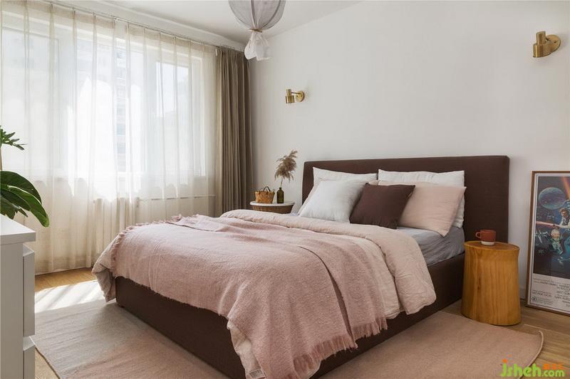 室內(nèi)設(shè)計師在主臥的設(shè)計上,設(shè)計師沒有將濃重色彩延續(xù),而是運用了更加舒緩自然的“莫蘭迪色系”,藕粉色,淡中帶暖,寧靜而柔和,無形中添加了高級色感的輕熟型格,與同樣柔和的杏白、淺棕、栗色搭配有一種靜態(tài)的和諧美。