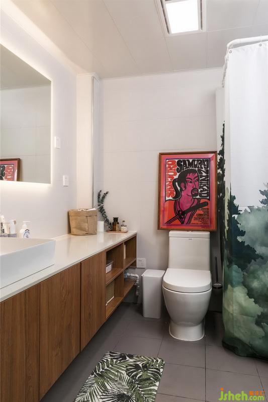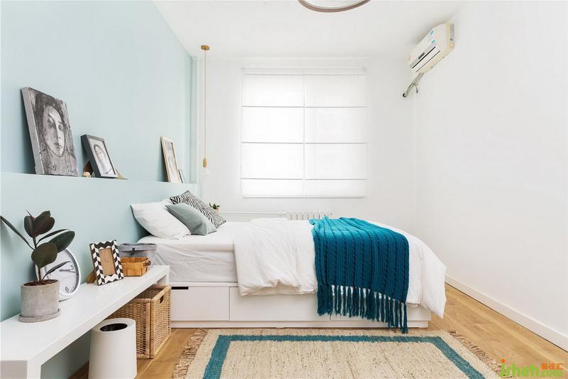 因為常住人口只有兩個,所以三居的結(jié)構(gòu)沒有必要,有一間作為畫室使用,另一件作為客臥,用于平時接待。設(shè)計上還是從色彩入手,清澈的月白藍,友好善意很符合客臥的定義。