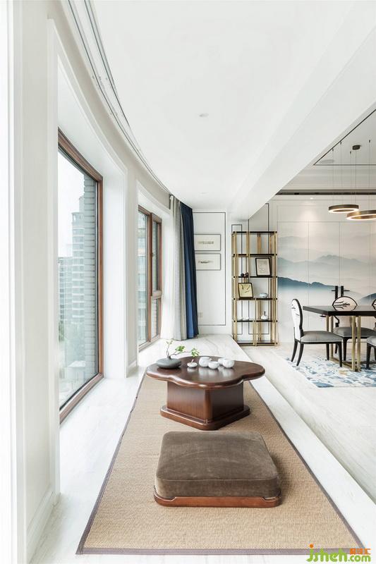 消融仕與隱的對立,物質的豐足與精神的獨立攜手兼得?!案毁F山林”的理想境界,便是將金闕丹墀與桃源仙境結合。因此室內設計師將對山水意境的思考作為本案主體思想,貫穿設計始終。