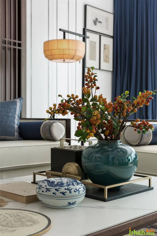室內設計師定制家具以白色為主配以藍色軟飾,造型素簡,整體空間雅致沉穩(wěn)、氣度不俗。由于公共區(qū)域是整個家庭的活動區(qū),除了男業(yè)主傾向的中式風格,設計師還融入了現代的元素,金屬元素在家居和擺件之間的運用讓整個居室環(huán)境更包容。