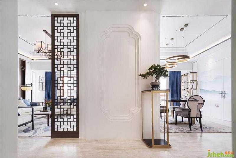 原戶型的入戶門是正對一整面窗戶的,不論從風水還是自然對流來說都非常不利,室內設計師在這一位置做了屏風阻隔。海棠花造型的實體墻板與鏤空木質格柵,一藏一現,虛實相生,實可空靈,虛可凝想,實而不塞,虛而不空。