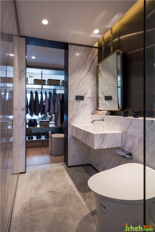 墻面與地面分別采用了灰色、白色的大理石,讓衛(wèi)生間明亮而簡(jiǎn)潔,懸吊的鏡面與一體化的臺(tái)盆凸顯簡(jiǎn)約低調(diào)的質(zhì)感美。