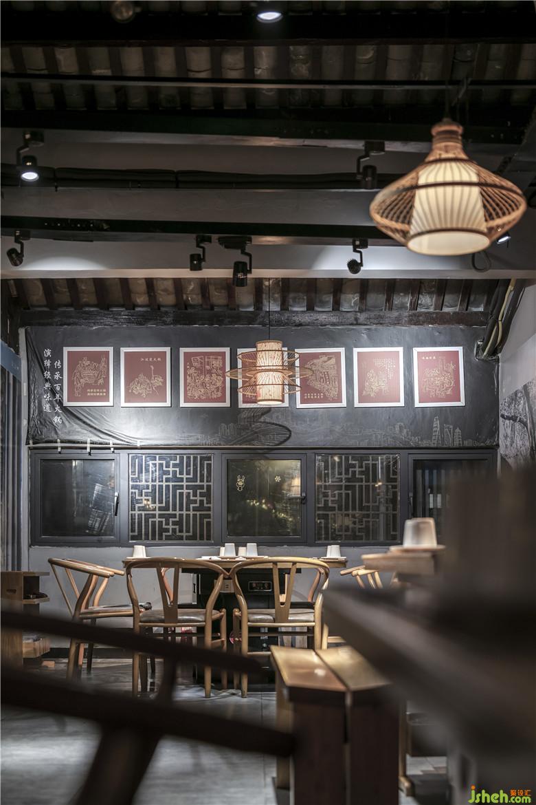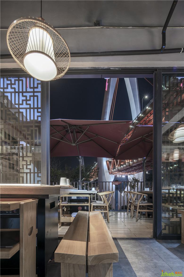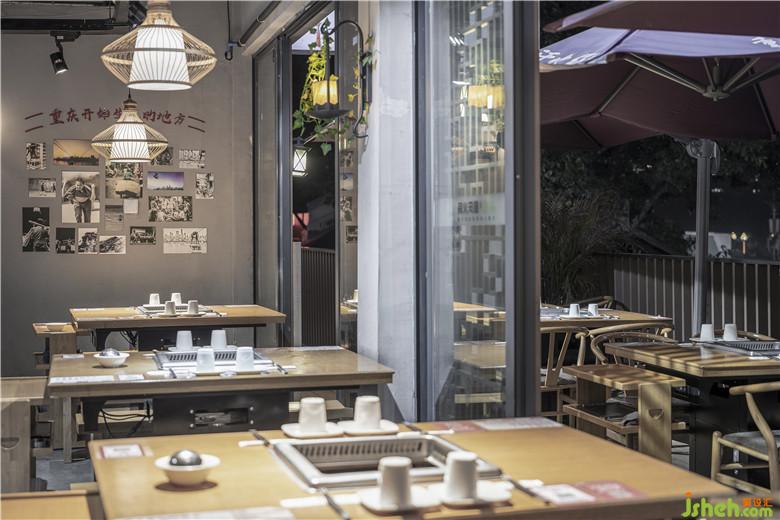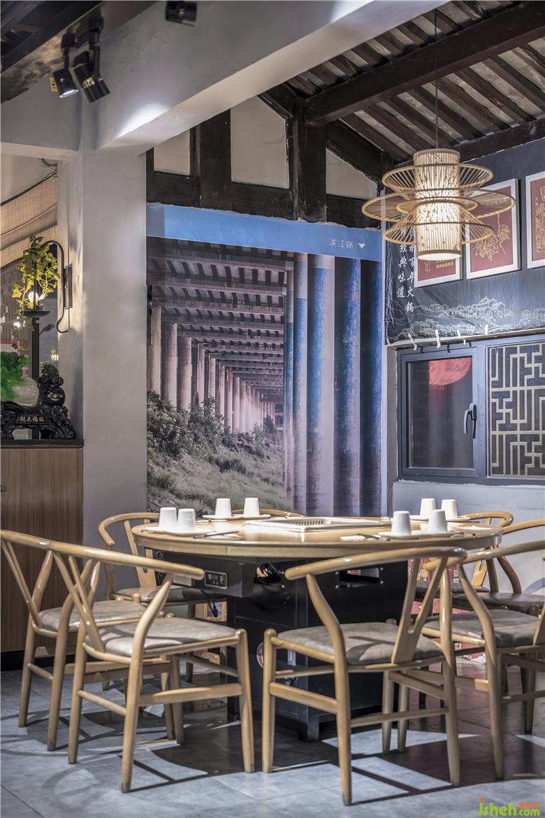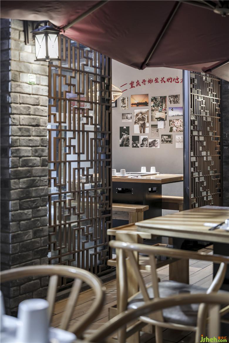 從紅色的東水門大橋獨(dú)特的色彩構(gòu)成,獲得靈感,既然周圍的建筑設(shè)計(jì)融合了鮮亮的建筑元素符號(hào),為什么不可以結(jié)合重慶本地青磚綠瓦運(yùn)用于空間設(shè)計(jì)呢?同時(shí),始建于清乾隆二十四年(1759年)的湖廣會(huì)館,亦是見證過重慶成為繁華商埠的歷史,而且在建筑和設(shè)計(jì)上,也是體現(xiàn)出對(duì)藝術(shù)自身審美的高度要求。所以在三樓包廂,紅色醒目的宣傳語:“只做地道老重慶味道”,大膽采用了紅色,掛在墻壁的白色勺子,滿滿的豌豆、綠豆和辣椒等等,與之互相呼應(yīng)。餐廳設(shè)計(jì)