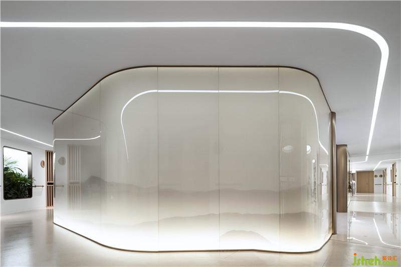 中央?yún)^(qū)域設(shè)計(jì)師沒有用傳統(tǒng)式實(shí)墻作為隔斷,而是以半透明的玻璃隔斷,賦以山水之墨,大氣磅礴。一方面使空間更加通透,打破實(shí)墻的壓抑感,另一方面又以山水之態(tài)氤氳空間氛圍,空靈而自然。