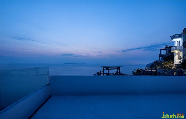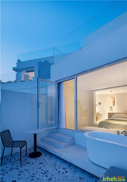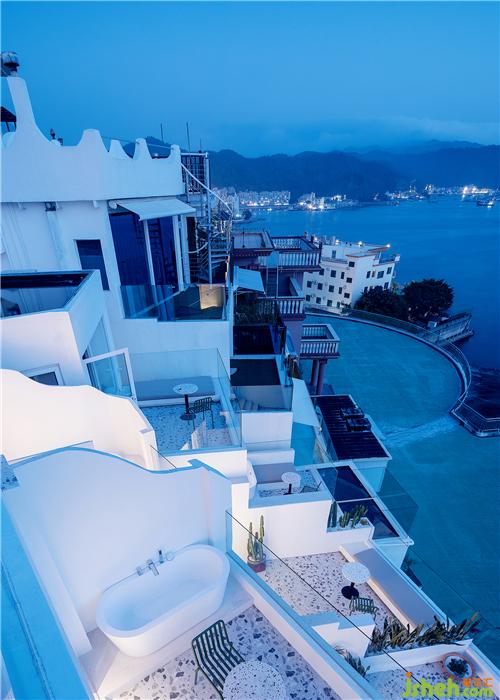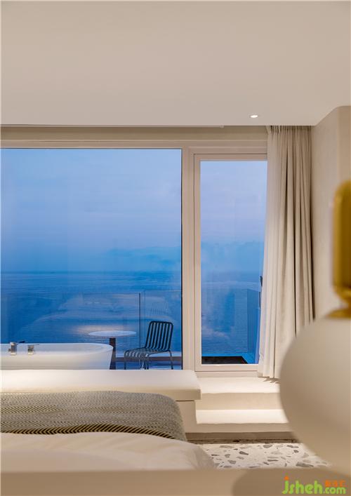海與遠(yuǎn)天銜接,猶如一片無垠而繁茂的牧場,白浪閃著琉璃瓦的光澤徐徐涌來,近處錯(cuò)層疊落的白房子呼應(yīng)著海岸線的疊石小丘……人在這樣一片純粹而濃郁的藍(lán)色之中,感受純粹的自然與色彩間流露出的澄澈與美好。酒店設(shè)計(jì)