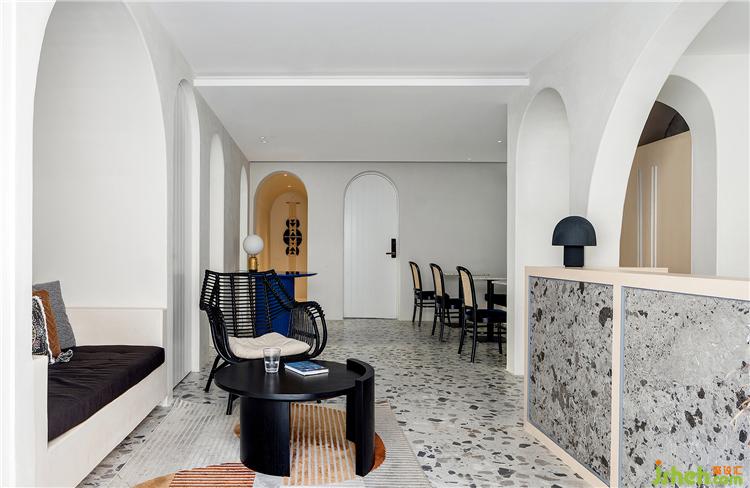 步入接待區(qū),一眾白色的墻面與隨處可見的拱形門洞圍合出空間布局,搭配上大理石細(xì)碎的花紋,讓整個(gè)空間既柔美又帶著莊重感。酒店設(shè)計(jì)細(xì)節(jié)上于當(dāng)代主義中擇善而取,運(yùn)用手工編織草帽、布畫以及民族風(fēng)抱枕、掛件、地毯等裝飾,作以承載情感與意境的美學(xué)表達(dá),使得野趣靈動的氣韻在空間中轉(zhuǎn)意迭出,共同勾勒旅居生活的美學(xué)質(zhì)感。