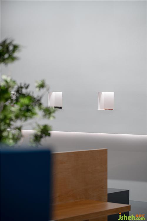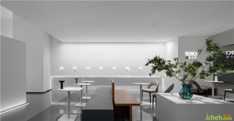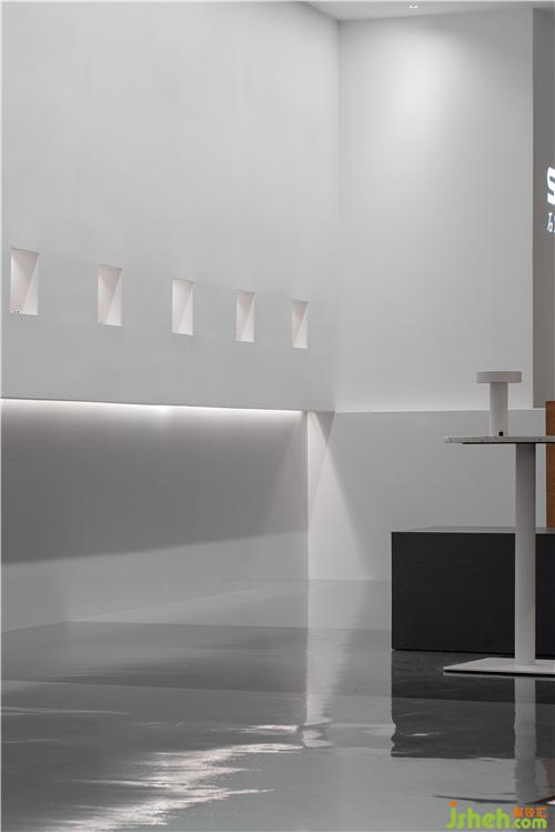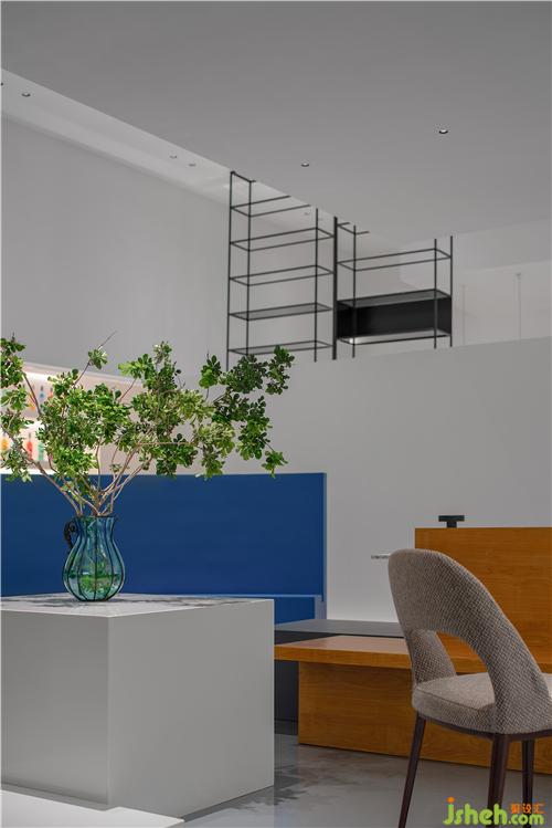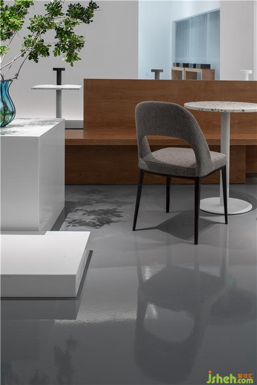 隨著動線的規(guī)劃步入休閑區(qū),設計師別出心裁地運用弧形曲線造型座椅,形成空間體塊的凹凸感,弱化整體視覺的平面化,建構起錯落有致的空間層次感。同時,弧形體面折射出光影的明暗變化,為空間增添了鮮明生動的藝術感表達。展廳裝修設計